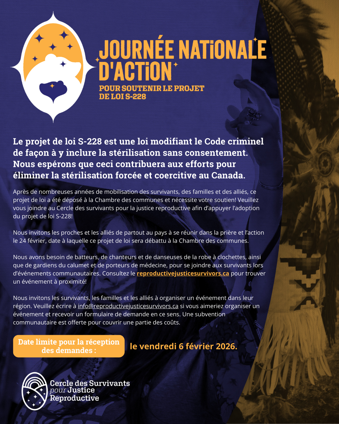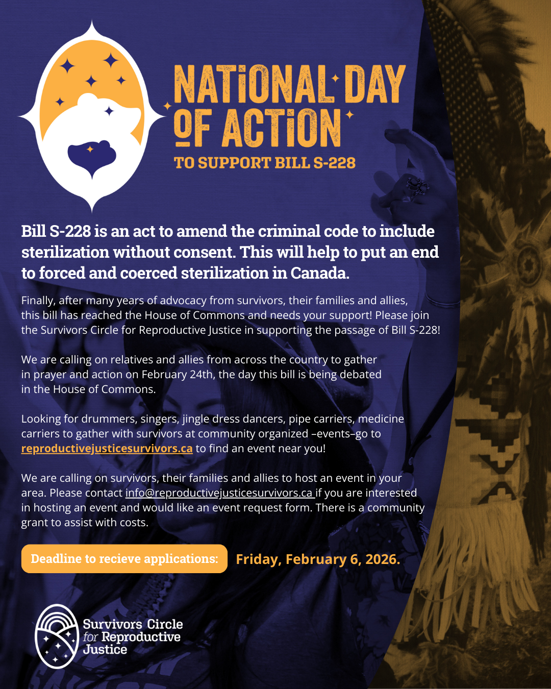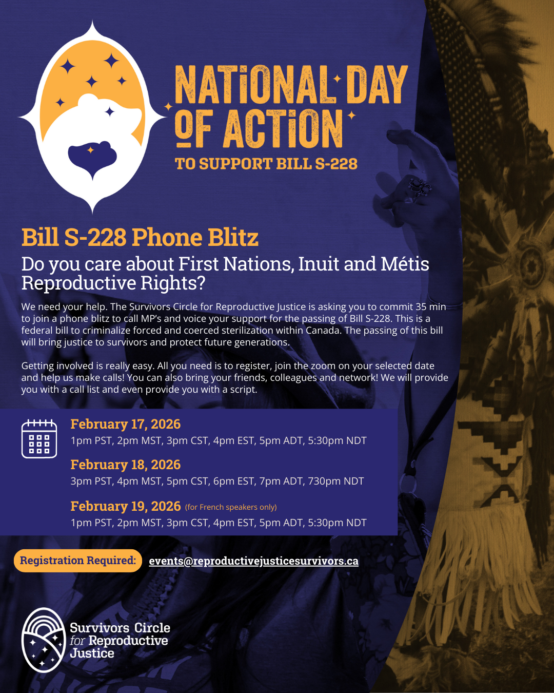The Survivors Circle for Reproductive Justice is organizing a National Day of Action to Support Bill S-228 on February 24 2026.